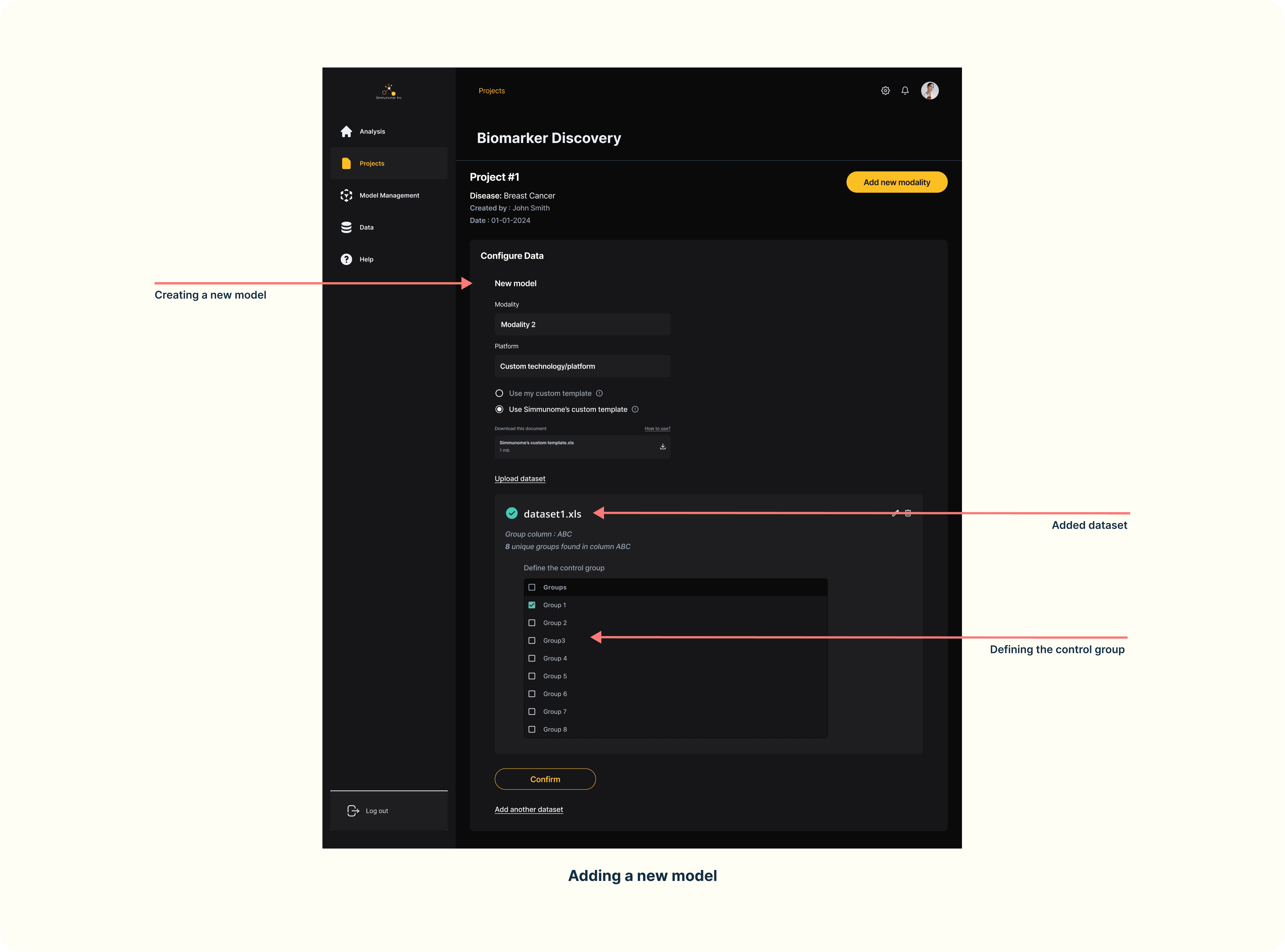 The second feature I designed was the upload flow to create a project, identify which group is the control group, and reconcile groups if more than one modality is used to generate an analysis (also known as Group reconciliation).