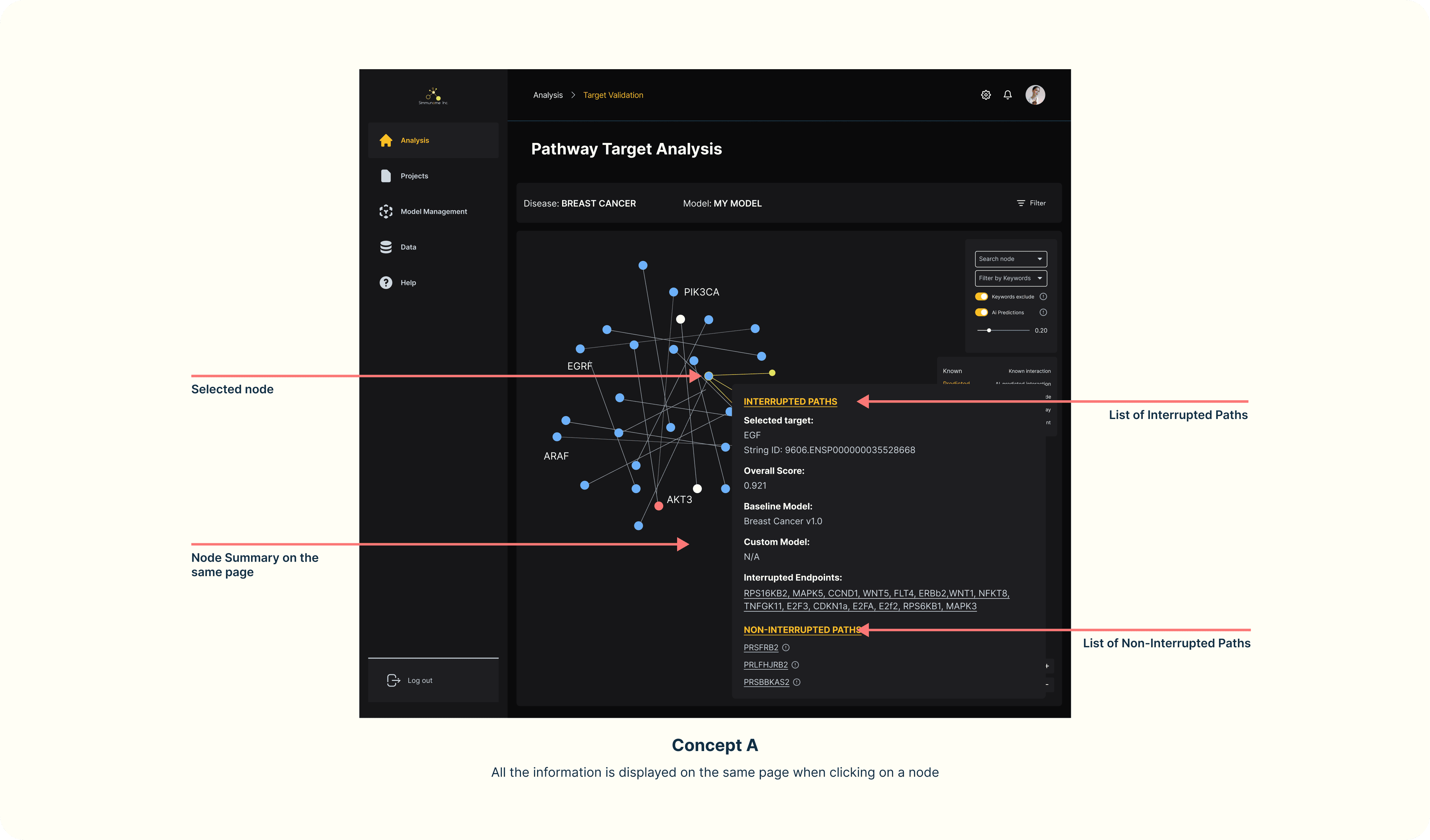 Concept A All the information is displayed on the same page when clicking on a node.